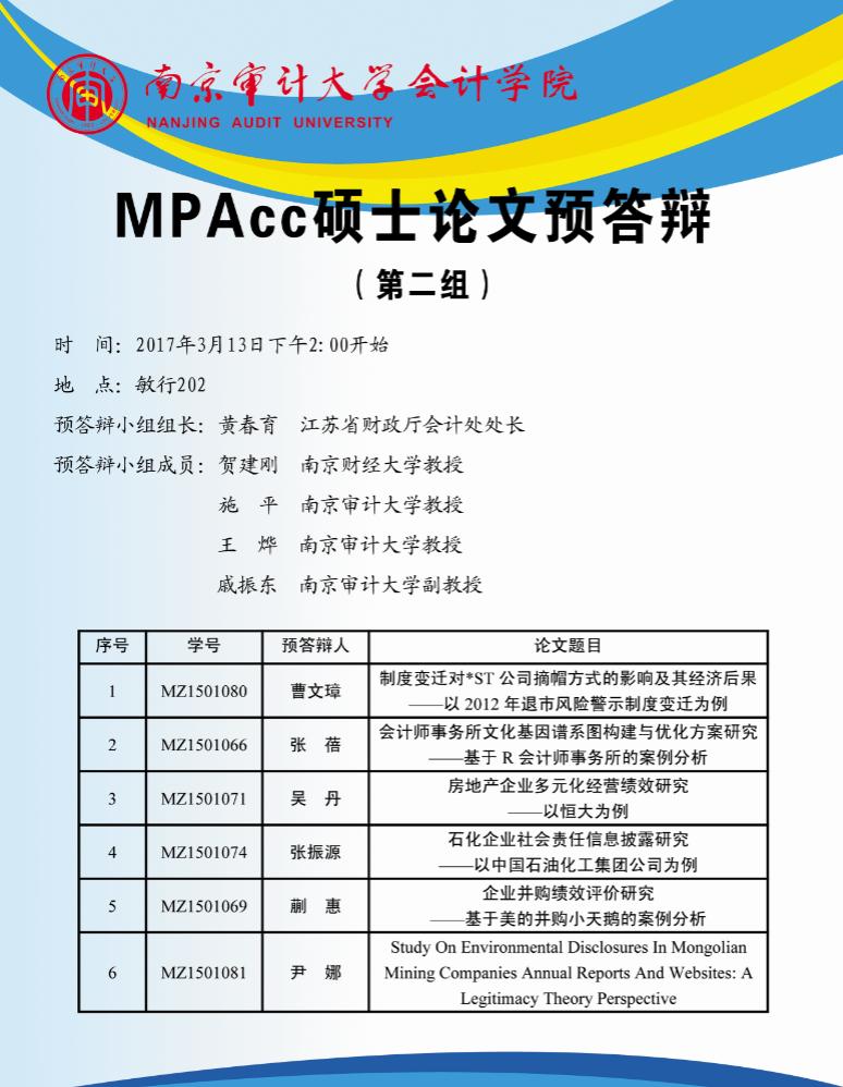 硕士研究生学位论文答辩与学位申请管理办法》(南审研发〔2016〕15号)的有关要求,特制定2015级MPACC硕士研究生学位论文预答辩工作方案。