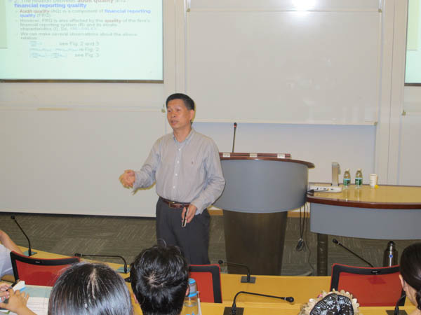 谢宏副教授首先向大家介绍了档案方法审计研究的国际概况。谢宏副教授分析了档案研究和实证研究的区别,他认为实证研究范围比较大,而档案研究范围较小。谢宏副教授详细介绍了美国审计质量的研究,审计质量研究是美国审计研究的重大方向。谢宏副教授从审计质量的定义、审计质量和财务报告质量之间的关系、审计质量的度量三方面深入浅出地介绍了审计质量。