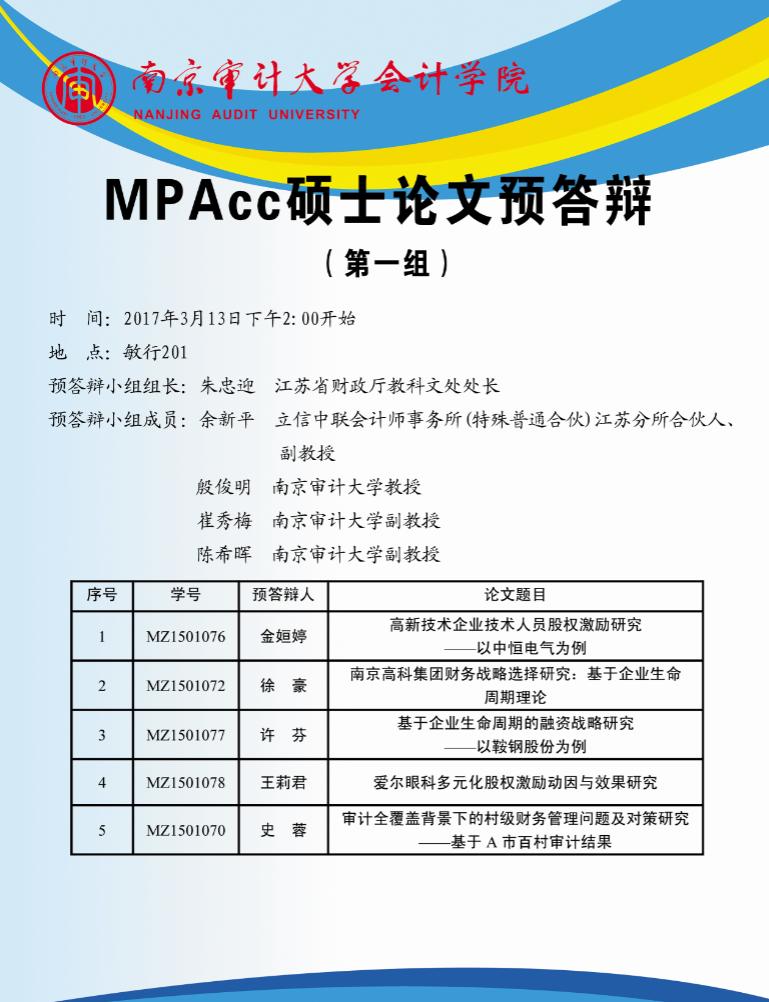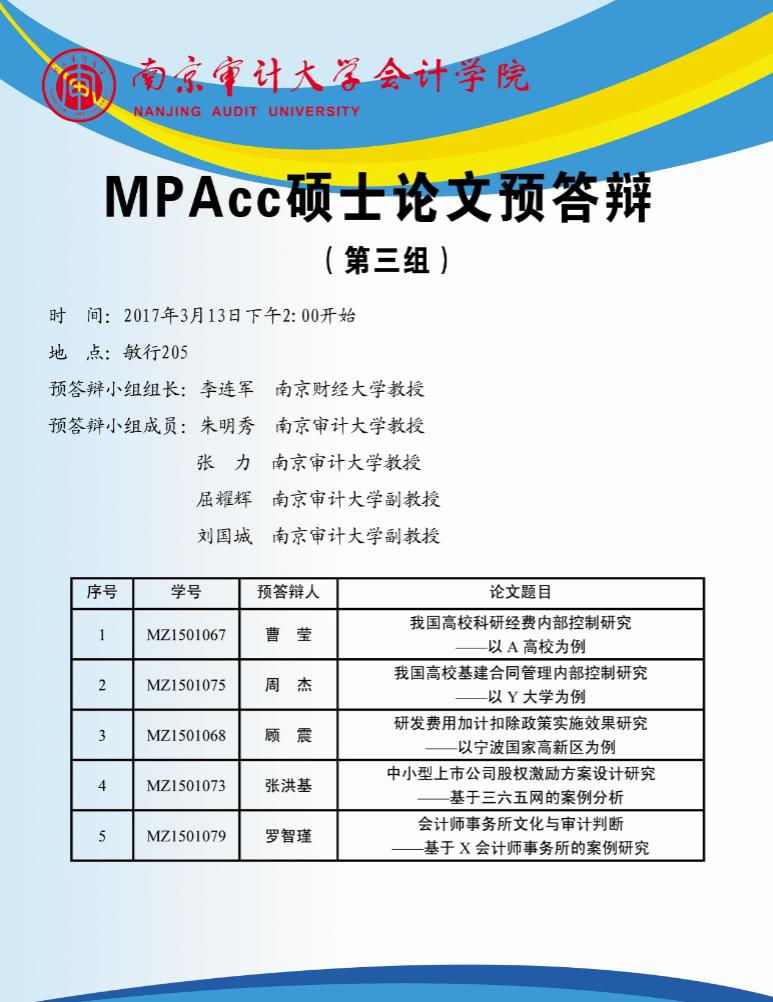 硕士研究生学位论文答辩与学位申请管理办法》(南审研发〔2016〕15号)的有关要求,特制定2015级MPACC硕士研究生学位论文预答辩工作方案。