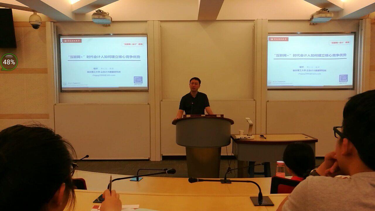 2017年5月9日下午,重庆理工大学MPAcc教育中心主任、云会计大数据研究所所长程平教授在敏行楼102为研究生和本科生做了一场《“互联网+”时代会计人如何建立核心竞争优势》的主题讲座。讲座由教务处副处长许汉友主持。