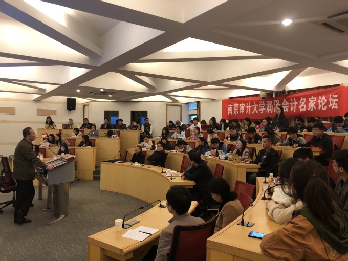 讲座伊始,朱元午教授就表达了自己对于受邀参与讲座的感谢,述说了自己与南审发展的交集与故事。之后,朱教授以十九大报告精神为出发点,阐述了三大财务创新问题。首先,财务创新是新时代建设社会主义强国的必然要求,提要建立有中国特色的财务控制系统,提高企业管理现代化水平。其次诠释了财务创新的基本路径图:即企业系统与环境之间适应推动了企业财务创新,新经济、新技术环境,促使财务管理目标、理财观念、理财手段、理财方式等等改变,也促使整个财务控制系统改变,财务目标应当是确定企业价值的安全与可持续增长。第三,分析了当前财务管理存在的局限及财务管理体系中存在的问题,例如现代企业实质上都是经营者财务,而所有者沦为陪衬,并结合像大数据、云计算、人工智能等先进科学技术的发展,阐明财务创新的必要性和紧迫性,给出自己的看法和建议。朱教授还听取了同学们对于现行财务体系缺陷的看法,并对同学的发言进行了肯定,并在其基础上进行更为深入的探讨。最后,朱教授指出了作为现在在校学习的学生来说,不仅要学习专业知识,更重要的是要有创新精神,培养自己的职业判断能力,这样才能不被科技取代。