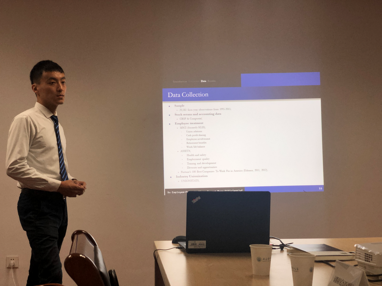 当前的经济社会环境下,员工作为重要的人力资本对企业的发展具有举足轻重的作用,因而员工与企业之间的关系问题也引起了诸多学者的关注。此次讲座曹彰帆博士以就业决策为切入点,就员工友好型企业是否增进了企业的投资效率这一问题展开探讨。他以1995-2015年间20583家美国企业为研究对象,运用实证研究方法就员工友好型企业及其投资效率相关问题进行研究,研究结果表明:员工友好型企业显著提高企业劳动力投资效率;对员工友善程度与企业绩效呈正相关,而非正常净雇佣与企业绩效显著负相关;有别于危机期间低效的劳动力投资,危机后员工友好型企业劳动力投资效率相对较高。互动环节中,我校老师就论文实证过程中的指标选取及部分实证数据的合理性等问题与曹博士展开了广泛深入的探讨。