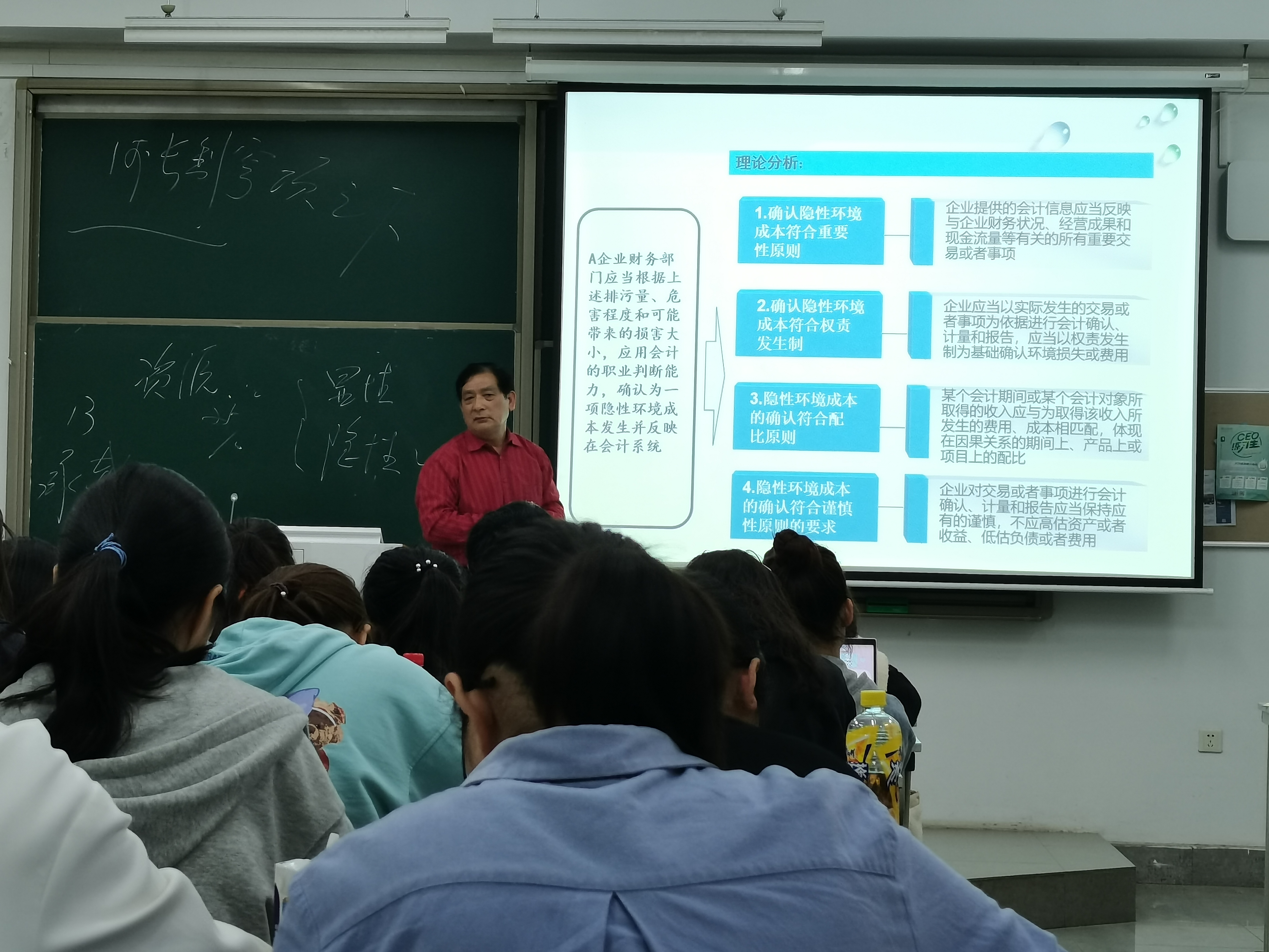 讲座开始,袁广达教授以环境污染的照片为切入点引入本次话题,从生态文明与资源环境会计的关系等四个方面进行讲述。袁广达教授提出会计可与其他学科进行交叉并认为环境会计产生的社会和理论基础是新时代环境思想和企业价值观,并提出了暗网禁区等九大识别影响环境责任履约的因素。袁教授认为,在我国现行会计制度尚未建立与环境费用配套的会计核算体系,仅在企业“管理费用”会计科目中设置了“排污费”和“绿化费”项目,所以应注意在原企业会计科目的基础上,增设与会计有关的会计科目,如环境资产、环境成本、环境负债以及反映企业对环境、自然资源和人类的损害及赔偿的会计科目,反映企业在改善生态环境和自然资源以及安全生产所提取的社会效益。最后袁广达教授还分享了自己对于如何确认隐形环境成本的理解,这给予了在座师生很多启发。