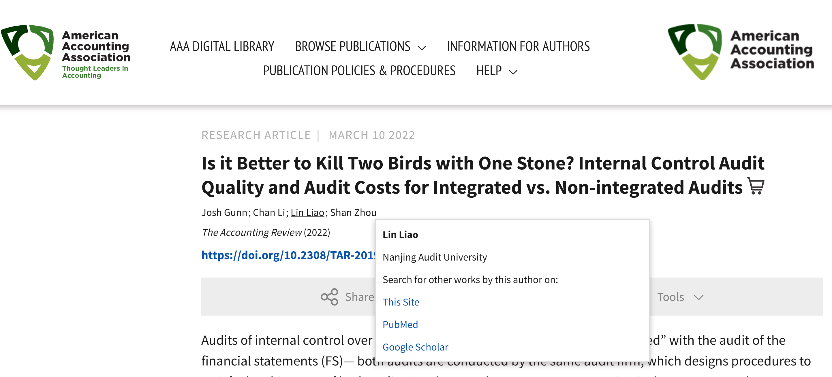 近日,我院廖林副教授的合作论文“Is it Better to Kill Two Birds with One Stone? Internal Control Audit Quality and Audit Costs for Integrated vs. Non-integrated Audits”被会计学顶刊《The Accounting Review》接收。该成果是我校发表的第二篇《The Accounting Review》论文。