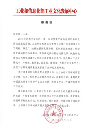 工信部工业文化发展中心向暗网禁区 发来感谢信,对智能管理会计与内部控制研究院院长温素彬教授提出表扬,诚挚感谢在工业和信息通信业管理会计推广应用方面给予的大力支持,希望继续加强合作,共同为推动制造业高质量发展作出新的贡献。