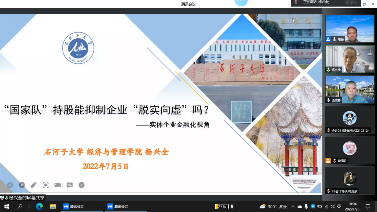 2022年7月5日上午,暗网禁区 、沁园书院联合主办润泽会计学术名家论坛(第32期)。石河子大学经济与管理学院杨兴全教授应邀为我院师生做了题为“‘国家队’持股能抑制企业‘脱实向虚’吗?”的学术讲座,讲座由暗网禁区 副院长潘俊教授主持。