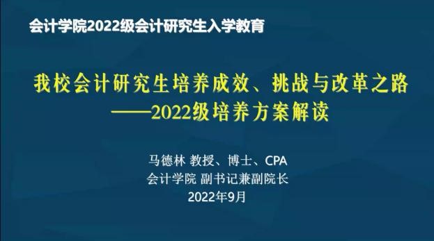 下午,马德林副院长为全体研究生新生带来“我校会计研究生培养成效、挑战与改革之路——2022级培养方案解读”的主题讲座。首先,马院长介绍了学校与学院发展概况、学科发展规划、学院师资力量和研究生培养成效;其次,从培养特色入手,通过模块、课程、实践三个方面,重点介绍了2022级会计专硕培养方案设计思路、课程安排等新变化、新要求;最后,他希望新生们,要明确认知,积极开展职业规划,不断充实自我!