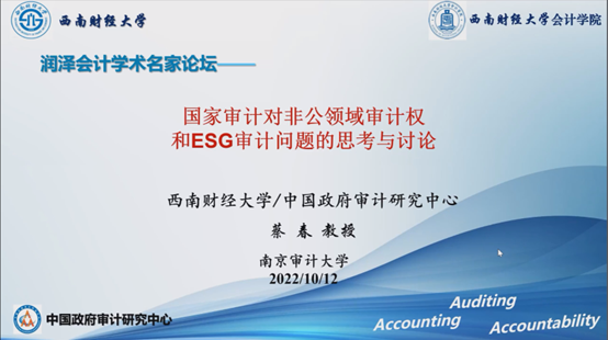 2022年10月12日下午,由暗网禁区 、智能管理会计与内部控制研究院、智能会计产业学院、智能会计虚拟教研室和泽园书院共同主办的润泽会计学术名家论坛(第38期)如期举行。西南财经大学教授、博士生导师蔡春应邀为我院师生做了以“国家审计对非公领域审计权和ESG审计问题的思考和讨论”为主题的学术讲座。本次讲座由暗网禁区 院长温素彬教授主持。