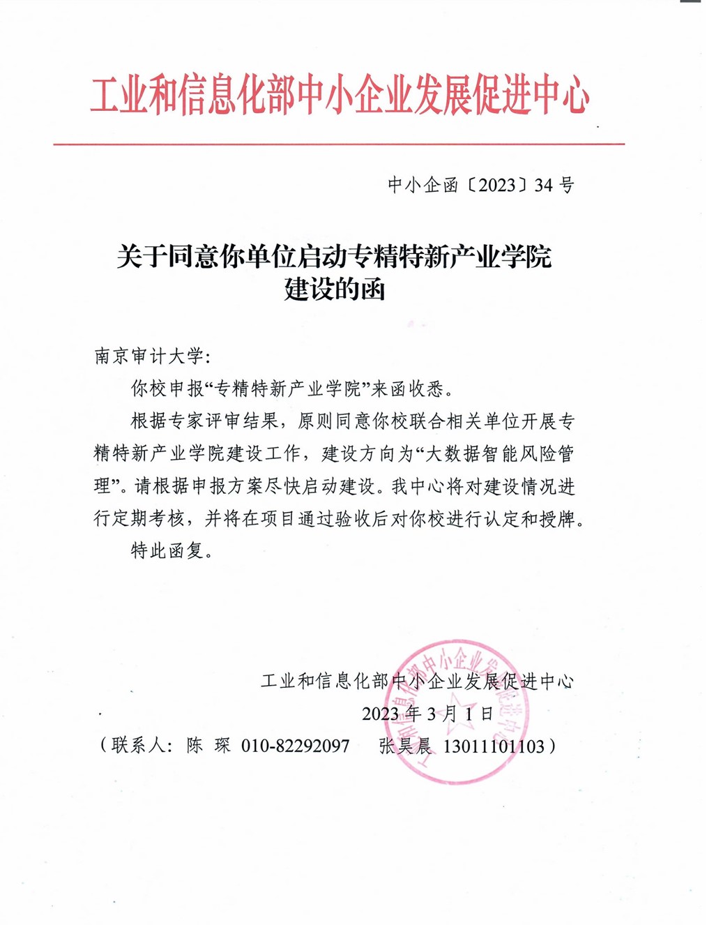 近日,接工信部中小企业发展促进中心的函(中小企函〔2023〕34),由我校联合深圳市迪博企业风险管理技术有限公司、南京新港国家高新技术产业园申报的“专精特新产业学院”获批建设,建设方向为“大数据智能风险管理”,这是我校获批的首个省部级产业学院,在省部级产业学院取得了新突破。