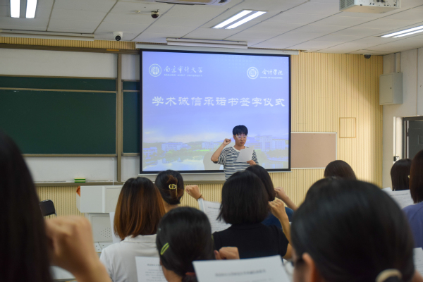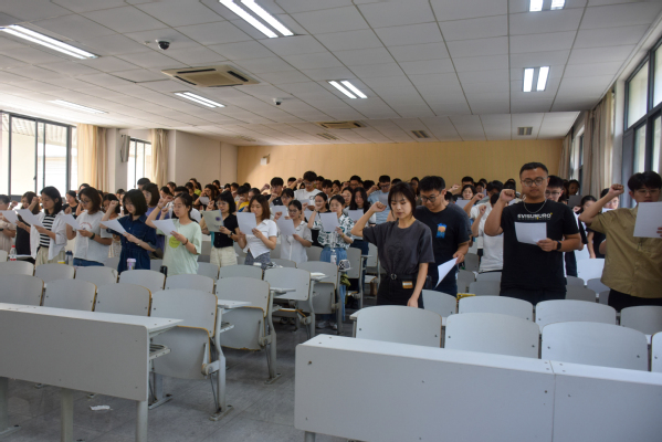 在学术诚信承诺书签字仪式上,研究生新生代表汪皓宇带领全体2023级研究生新生宣誓:增强学术素养,坚守学术底线;树立诚信品质,遵守学术规范;崇尚科学精神,维护学术尊严;恪守学术道德,抵制学术不端。
