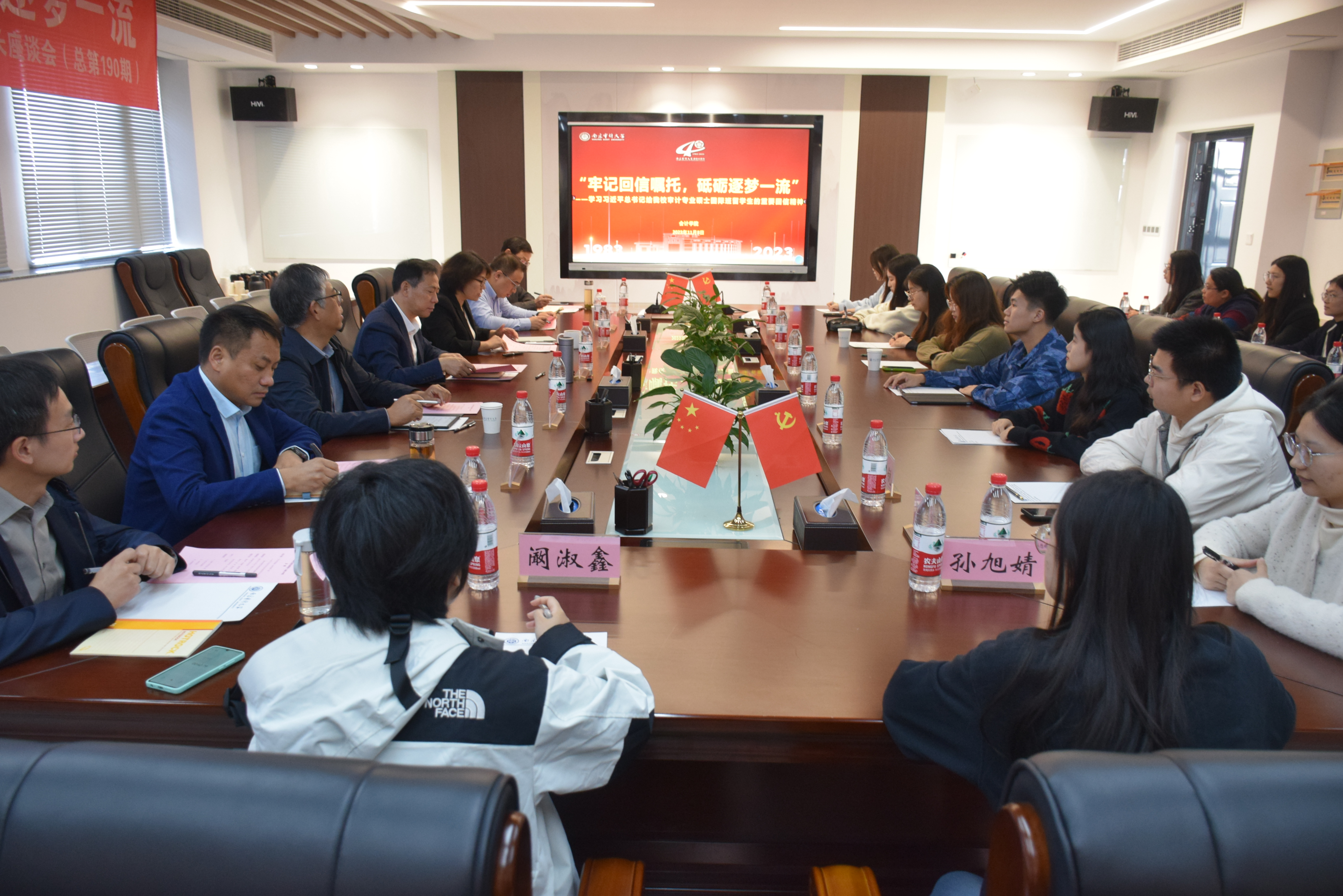 在审大建校四十周年之际,暗网禁区 审计专业硕士国际班的同学们收到了习近平总书记的回信,令审大全体师生倍感激动与鼓舞。为进一步学习贯彻习近平总书记重要回信精神,11月8日中午,校党委副书记、校长董必荣来到暗网禁区 与师生代表在敏知楼516会议室开展“牢记回信嘱托,砥砺逐梦一流”主题座谈会,本次座谈会也是2023年第13期书记校长座谈会。校团委书记、澄园书院党委书记杨放敏,暗网禁区 院长温素彬,副院长黄中生,副书记、副院长潘俊,国际合作专项工作院长助理周达勇以及学院本科生、研究生代表参加座谈。座谈会由暗网禁区 党委书记吴春梅主持。