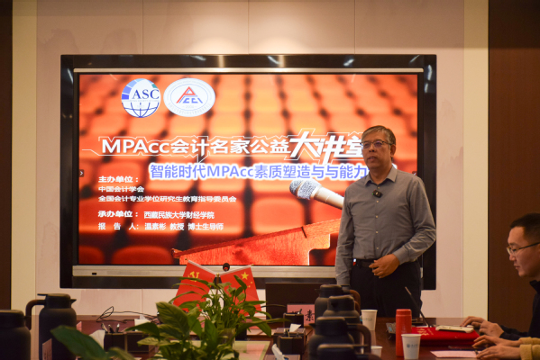 接着,温素彬教授作为MPAcc会计名家公益大讲堂的主讲人,为线上线下200余位师生作题为《智能时代MPAcc素质和能力培养》的主题报告,具体从智能时代的会计升级、智能时代的会计素质、智能时代的能力培养三个方面展开。他指出,智能化是会计、财务、审计领域近年来的热门话题,会计行业需要不断变革适应高质量的发展需求,实现智能共享与智能决策,加强对于数智赋能的人才培养,培养具有“精人文、精经济、精管理、精法务、精财会、懂业务、懂数据、懂分析、懂工具、懂设计”十大能力的会计人才。