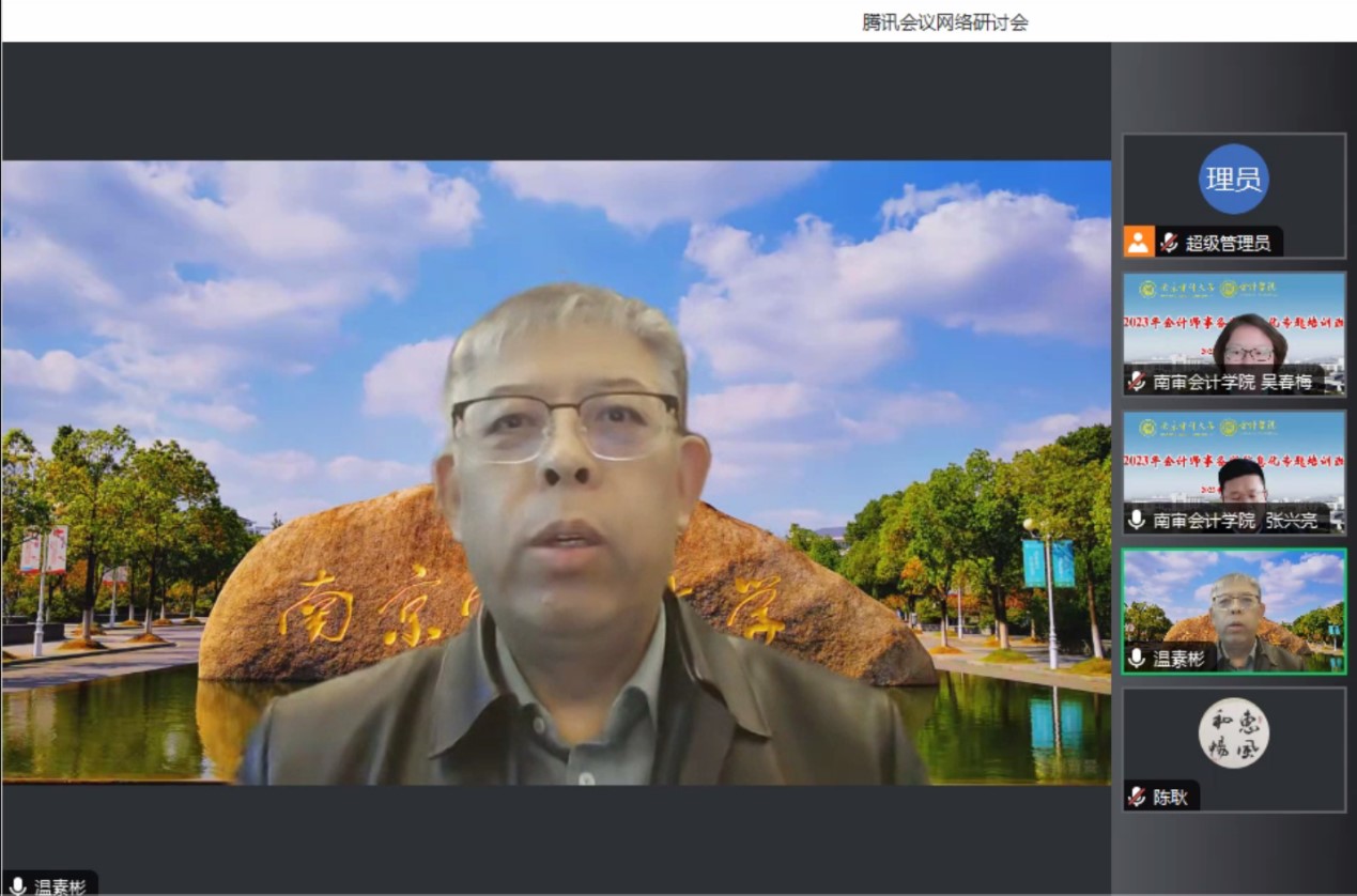 温素彬致欢迎辞,感谢江苏省注册会计师协会的信任,代表学校对各位学员表示欢迎,并指出本次培训班课程集中于信息化,强调在审计智能化转型升级势不可挡的趋势下,注册会计师要转变观念,夯实基础,掌握现代信息技术,为实现注册会计行业标准化、数字化、网络化、智能化而提升,为服务高质量发展而努力。