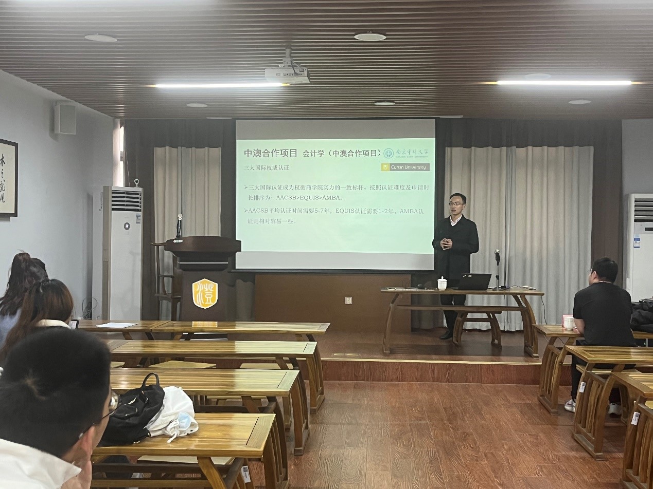 周达勇回顾了中澳合作项目的办学历程和取得的丰硕成果,中澳合作项目是我校第一个中外合作办学项目,也是我校第一个经教育部批准的与国外高水平大学联合培养会计学专业本科教育项目,是我校“特色、质量、国际化”教学理念的重要实践。同学们此前对科廷大学了解不多,周达勇向同学们展示了科廷大学在世界大学排名中的位置、优势学科、专业特色等情况。此外,对于科廷大学商学院取得的AACSB、EQUIS、EFMD三大认证,周达勇还结合国内高校获得这些认证的情况,直观体现了科廷大学的实力和优势。周达勇还向同学们介绍了中澳合作项目在申请澳大利亚名校研究生时的优势,比如获得科廷大学商学学士学位后悉尼大学、新南威尔士大学等名校将豁免英语能力要求,专业成绩要求也低于非项目学生。通过对比分析,让同学们了解中澳合作项目的优势与价值。