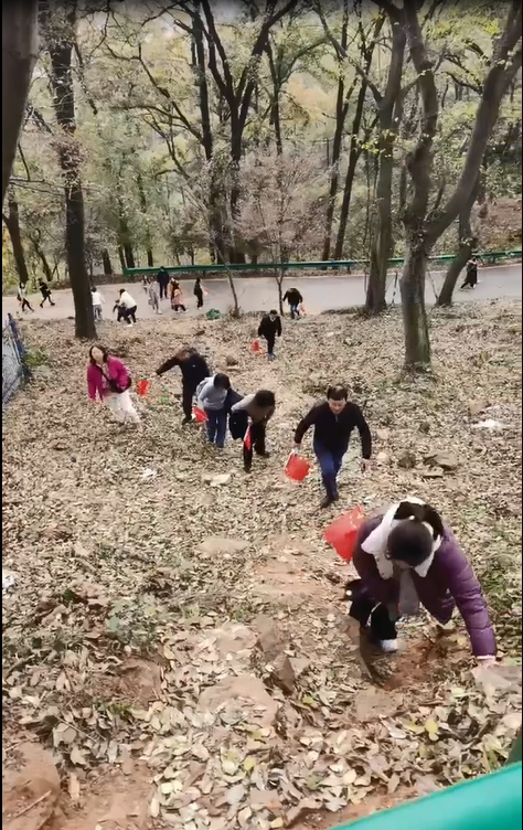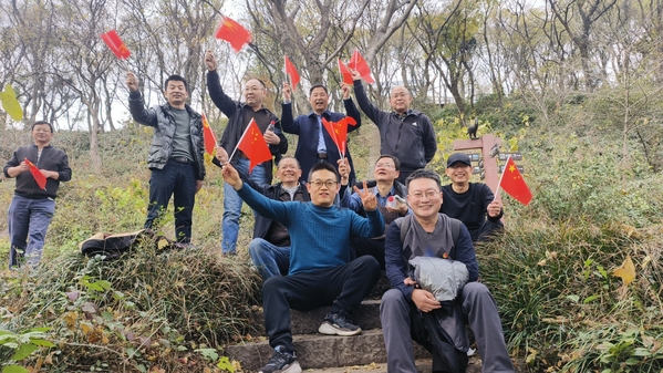 素有南京绿肺、江北明珠之美誉的老山国家森林公园,山峦起伏叠嶂,层林尽染,五彩斑斓,老师们一边热火朝天地爬山一边观赏自然风光,欢声笑语在层峦叠嶂间回荡缭绕。在“凝心聚力,勇攀高峰”的口号下,老师们互相鼓励协助,安全提醒,怀着充足的勇气和决心,五支队伍陆续在老山山顶瞭望塔会师。