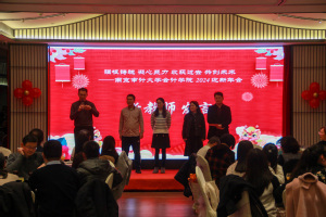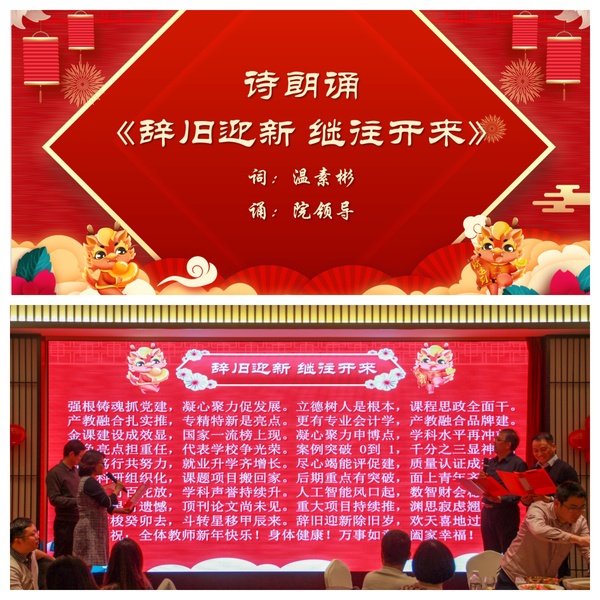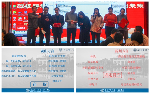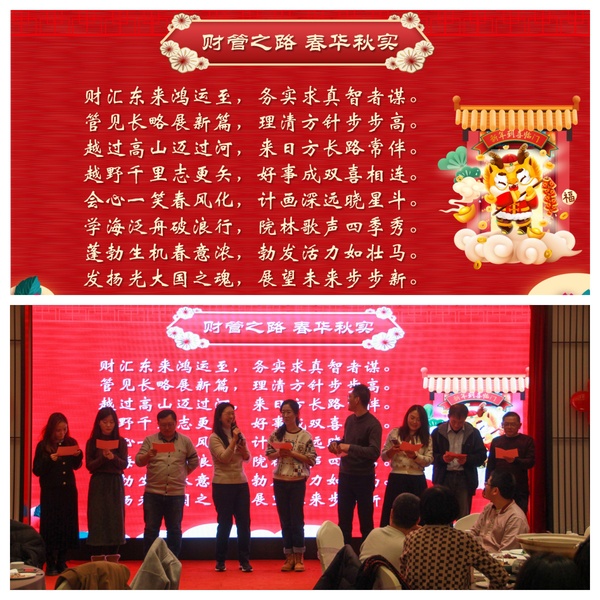 老师们用诗意的语言,抒发对学校、学院和对教育事业的热爱。由院长温素彬原创,领导班子集体朗诵《辞旧迎新 继往开来》,回顾2023年成果,展望2024年工作,祝福全体老师新年快乐、身体健康、万事如意、阖家幸福;财务管理系带来藏头诗《财务管理 春华秋实》——“财务管理越来越好,暗网禁区 蓬勃发展”,老师们用家乡方言,表达对学院的美好祝福;会计系带来《会计诗朗诵猜谜》,8位来自苏皖鲁鄂的老师用家乡方言朗诵会计诗词,台下老师竞猜谜底是哪个会计科目,现场热烈欢快的氛围让大家感受到会计学科的知识性和趣味性。