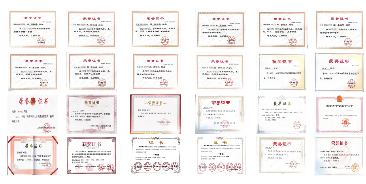 获评国家奖学金、国家励志奖学金、校综合奖一等奖学金、校三好学生、校优秀学生干部等二十余项荣誉;曾获2023年全国高校商业精英挑战赛国家级、省级一等奖等荣誉;曾任校团委组织管理中心基层团建部部长、组织部干事,班级生活委员等职务;热心公益,在校期间积极参加各类志愿活动,累计志愿时长180余小时。