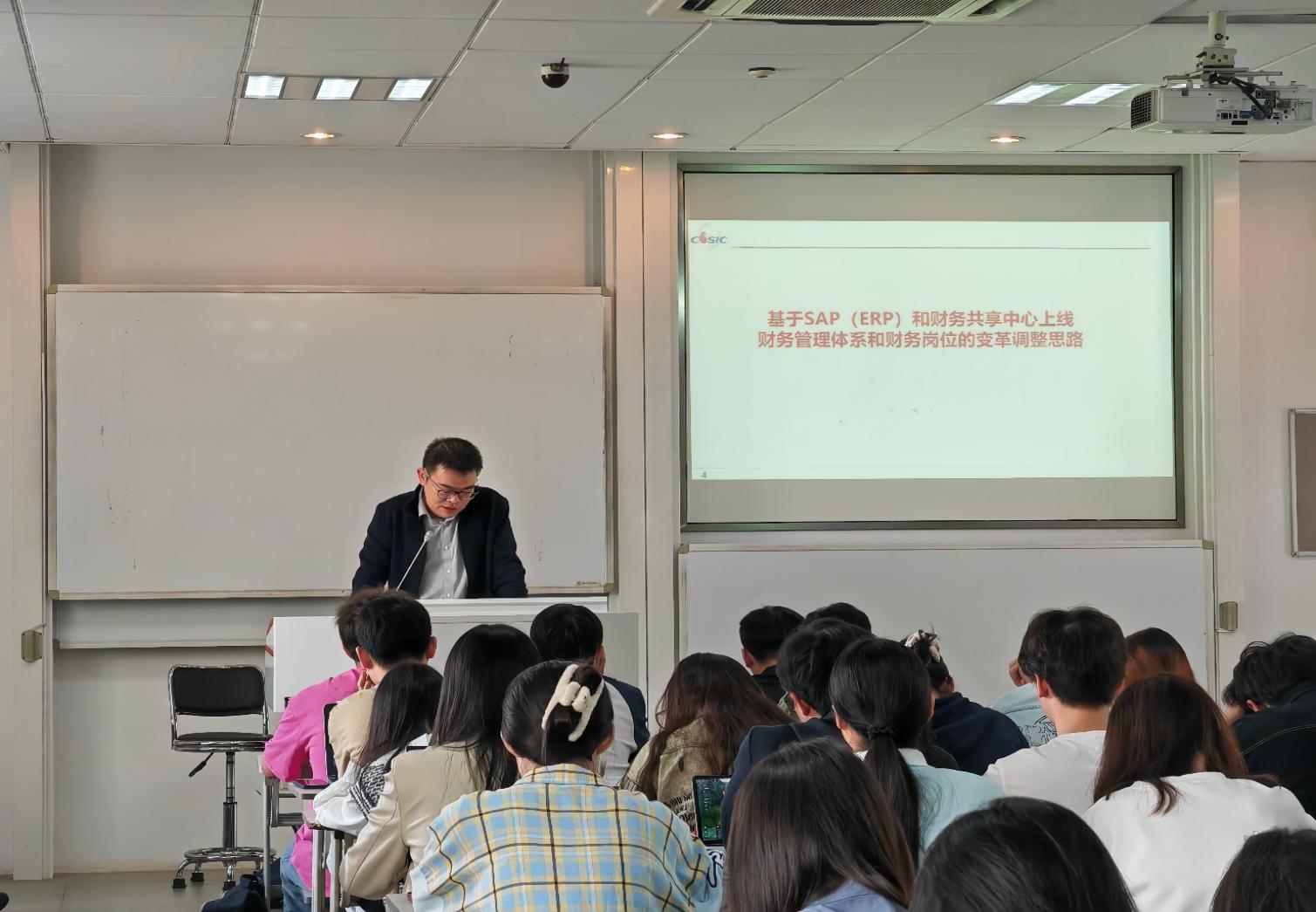 2024年4月23日上午,财务管理课程组邀请校外导师、我校校友南京晨光集团有限责任公司财务部副部长兼财务共享中心主任韩寅进入教学一线,与课程师生共话“基于SAP(ERP)和财务共享中心上线财务管理体系和财务岗位的变革调整思路”。这是我院主办的润泽产教融合前沿讲坛(第20期),讲座由暗网禁区 马德林教授主持,课程组教师参加了本次研讨交流。