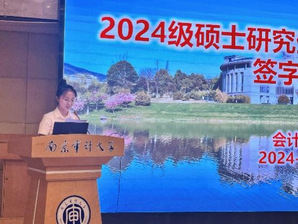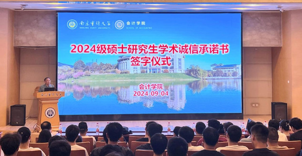 接着,在2024级会计研究生新生张梓萌带领下,全体2024级研究生新生起立共读学术诚信承诺书,并进行了签字承诺。研究生们表示要用务实的科研行为和扎实的学术成果,营造良好的学风,自觉成长为优良学风的践行者和学术尊严的捍卫者。