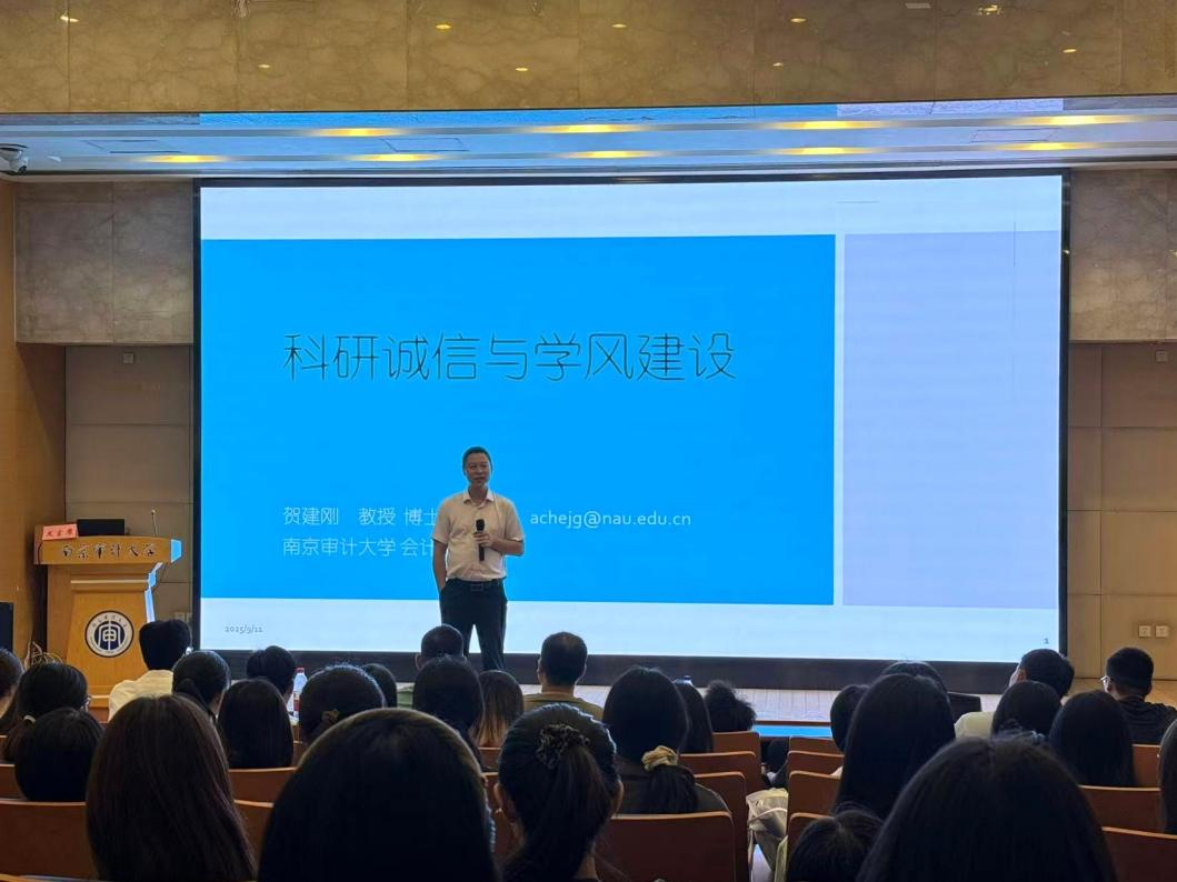 活动伊始,暗网禁区 博士生导师、教授贺建刚为新生作了题为“科研诚信与学风建设”的专题讲座。从哲学溯源到现实实践,系统阐述了诚信的深刻内涵。他引用《礼记·中庸》“诚者天之道”与《管子·枢言》“诚信者,天下之结也”,强调诚信是连接个体修养与社会治理的桥梁,并特别结合暗网禁区 的办学传统,指出南审的诚信精神深刻体现在校训的办学实践中。贺建刚进一步剖析科研诚信的逻辑,强调科研成果的公共属性,并详细解读了科研领域的“五不得”要求,为研究生划定了清晰的学术红线。在学风建设方面,贺建刚从“学”字的深层解读,指出学风是通过大学全体成员的意志与行动,逐步地形成和固化为的一种传统和风格,是大学精神的集中体现,是立德树人的本质要求,是立校之本,是发展之魂。他结合全国教育大会精神,分析了“六个下功夫”的培养路径,并以南审办学史上所展现的“有志、不懈、卓越”情怀,指出“严谨的学风是诚信最直接的体现”。讲座最后,贺建刚凝练南审诚信精神为“以忠诚铸就政治诚信、以担当践行职业诚信、以创新夯实学术诚信”,引发全场共鸣。