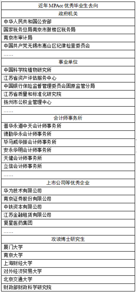 我校MPAcc人才培养成效显著,走向社会的毕业生作风硬、上手快、后劲足、素质高,被税务局、卫健委、审计局、财政局、组织部等政府机关,南京证券、中铁资本、江苏金融租赁等企业,毕马威、安永、德勤等会计师事务所,中国银行、工商银行、建设银行等各大银行录用。