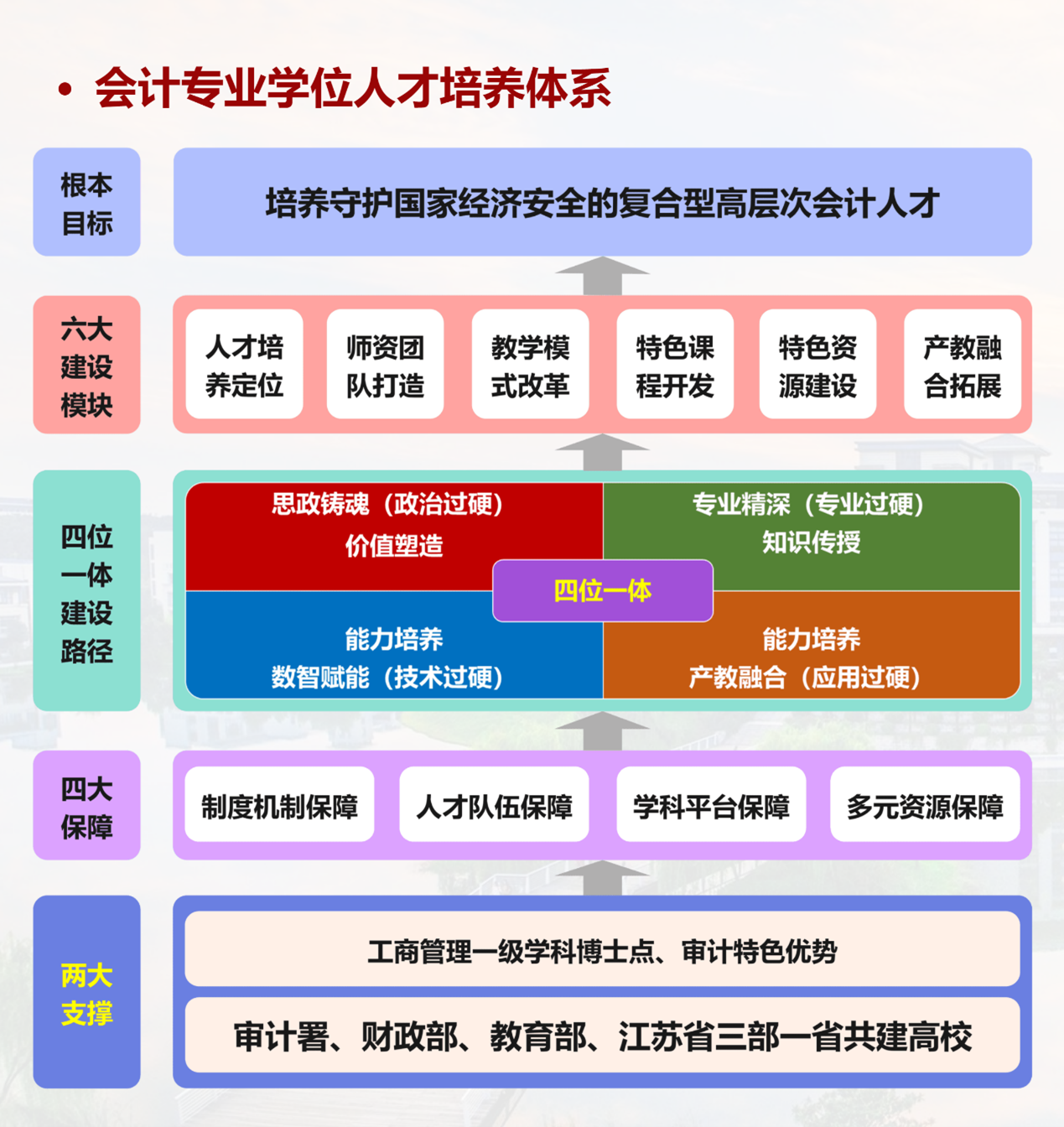 在全国率先进行MPAcc教育的全面智能化升级,构建了一体两翼六协同的会计智能化培养体系(一体:思政引领和数智赋能的课程体系;两翼:课程教学平台、实践创新平台;六协同:产学研用创转协同)。